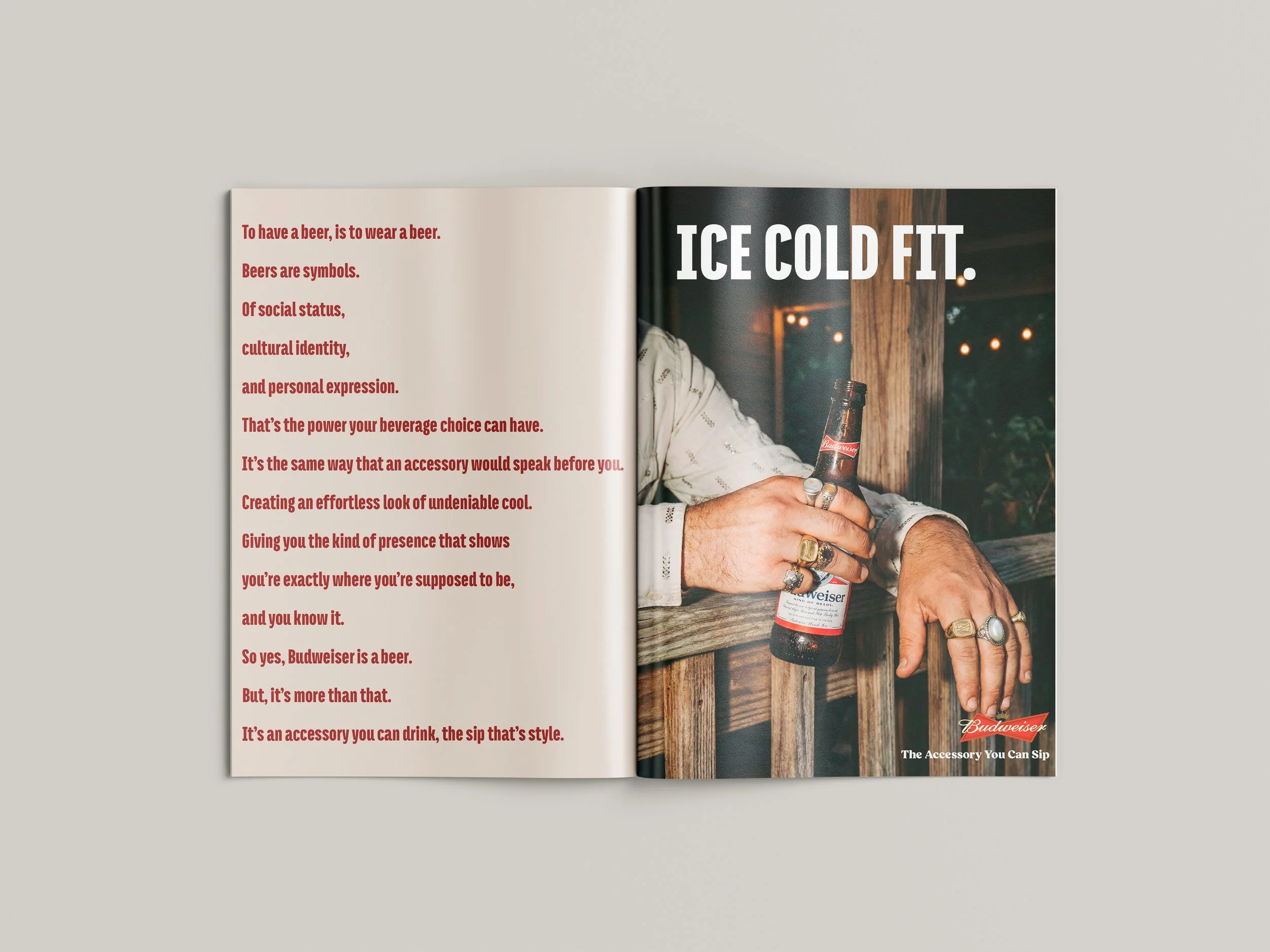 Gen Z are not big alcohol drinkers and if they do drink, beer is the least popular choice of all. They seek sweeter flavor variety, healthier options like a lower calorie count, and have a growing interest in spirits. There still remains an unspoken acknowledgement amongst their generation that beer is cool. You’ll often see beer merch worn by people who don’t even drink it, and if someone genuinely does love beer that alone is noteworthy. If we can’t change Gen Z’s taste buds, we can change the role beer plays. Let’s advertise Budweiser as an accessory, not just a drink.