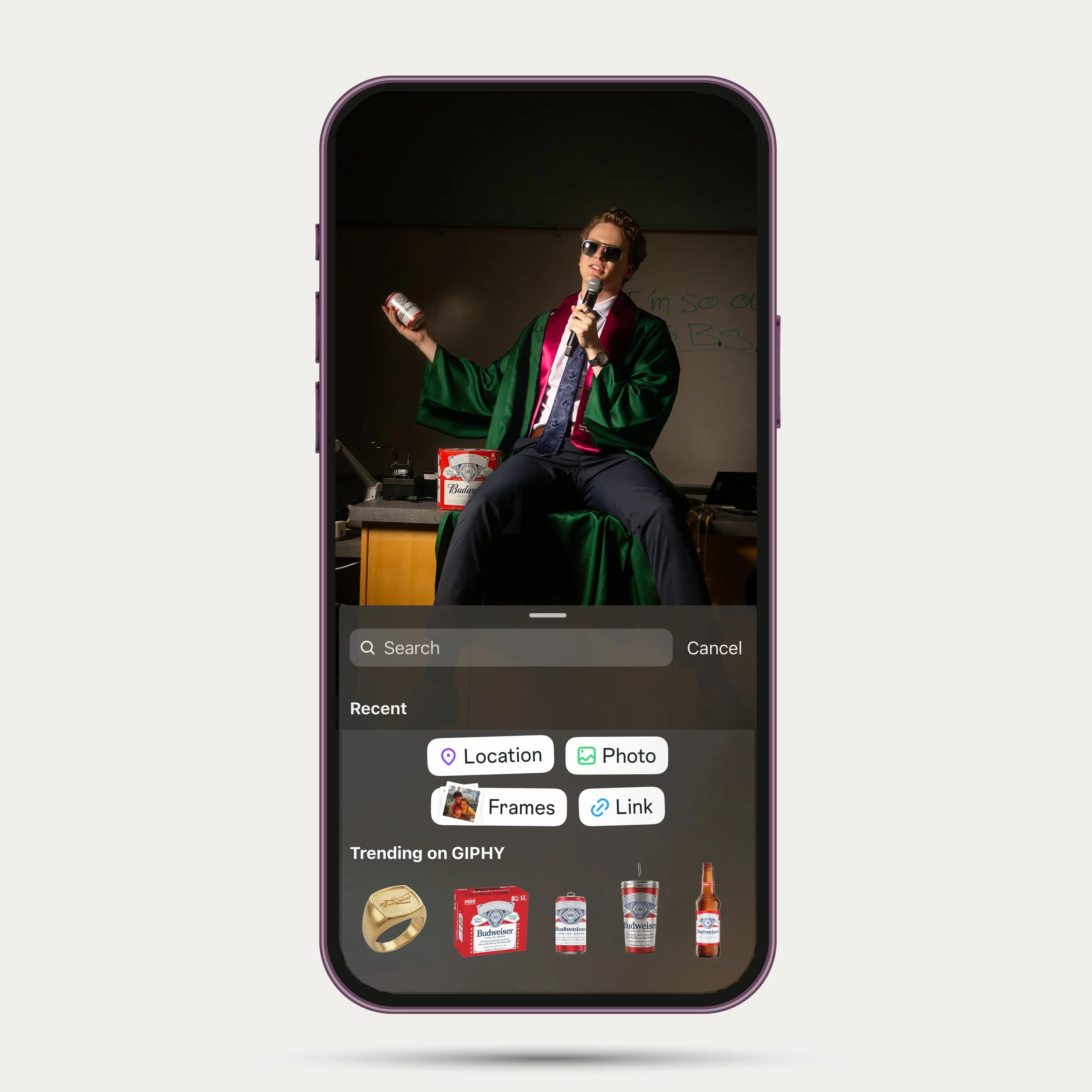 Budweiser instagram story sticker pack featuring cans, bottles, cases, and campaign related merch items. Fixes awkward or bare hands in photos, using Budweiser to complete your look and your shot.